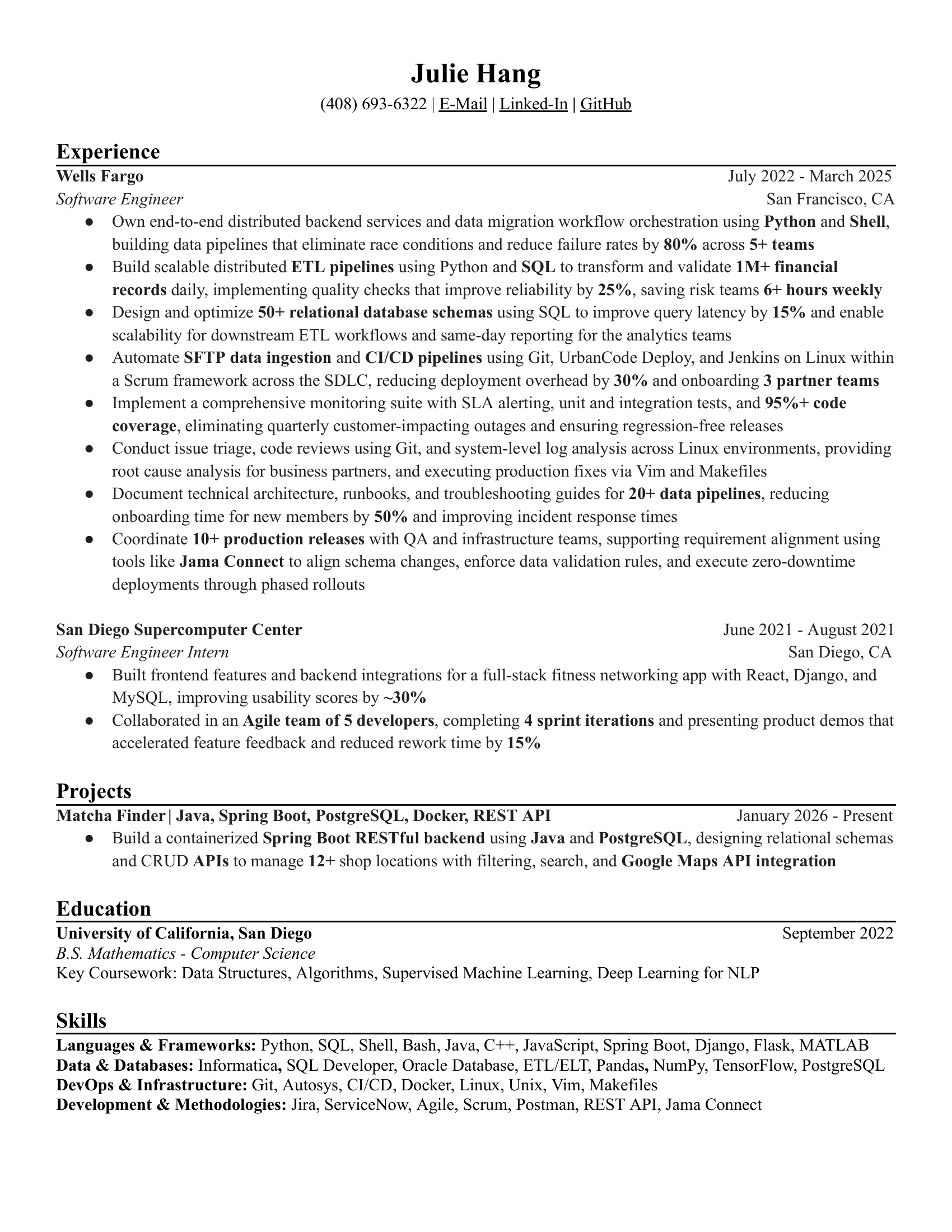 • Coordinate 10+ production releases with QA and infrastructure teams, supporting requirement alignment using tools like Jama Connect to align schema changes, enforce data validation rules, and execute zero-downtime deployments through phased rollouts